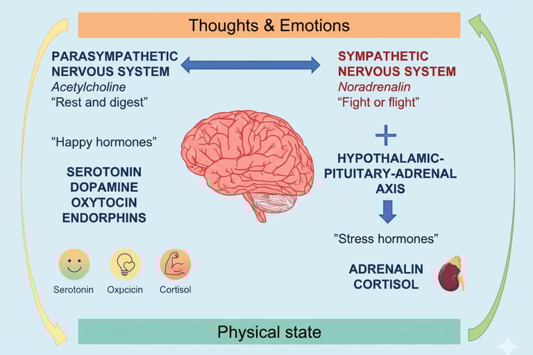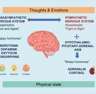 Your Thoughts and Emotions can turn the stress systems ON (e.g., worry activates cortisol) or turn the happy systems ON (e.g., laughter releases endorphins).